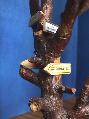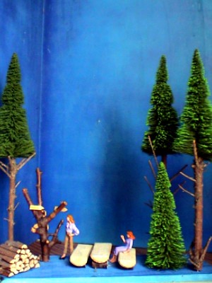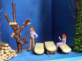 Beschreibung: Sitzgruppe mit Figuren, 4 Bäume,Wegweiser und Holzstapel |